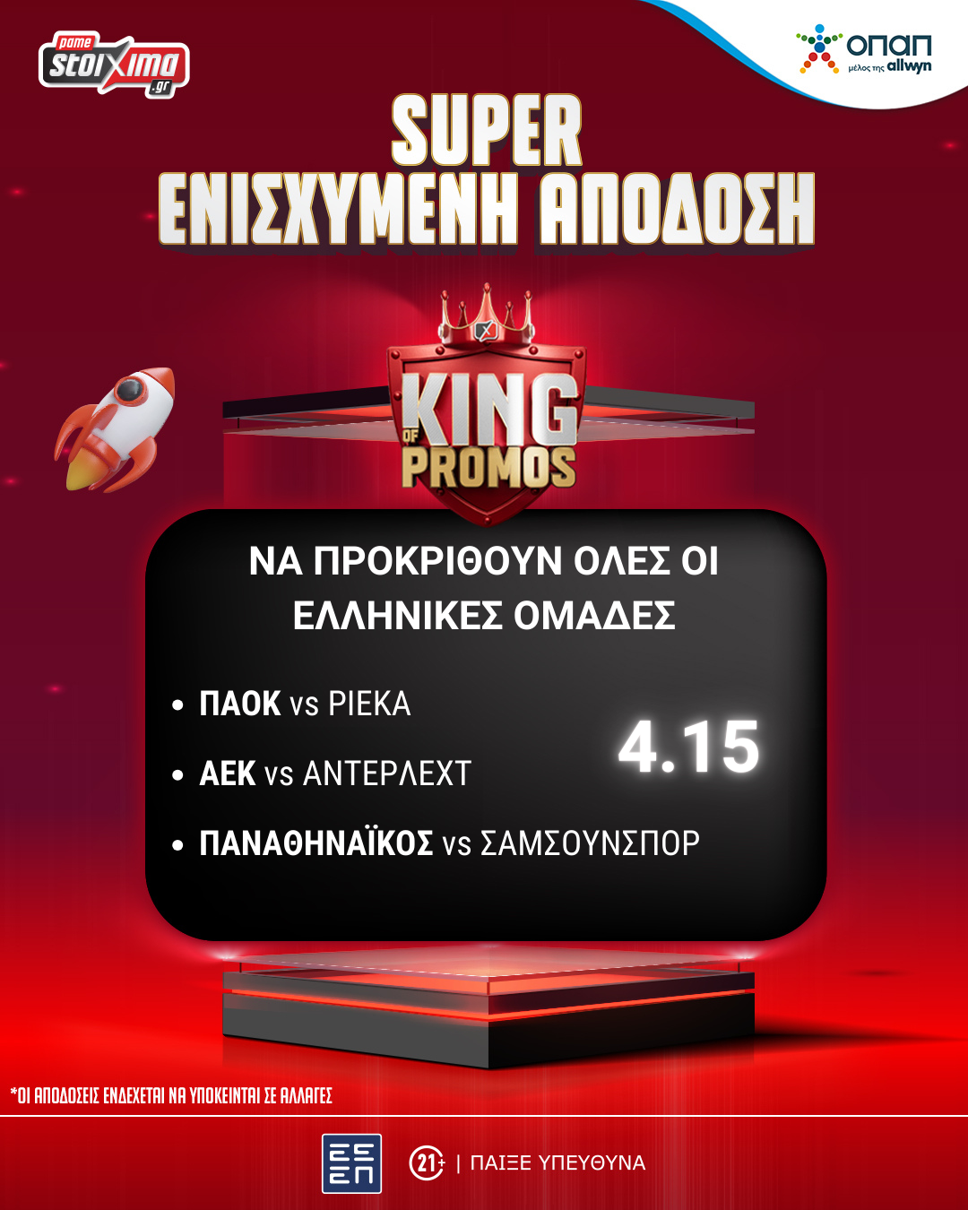 «21+ |Αρμόδιος Ρυθμιστής ΕΕΕΠ | Κίνδυνος εθισμού & απώλειας περιουσίας | ΓΡΑΜΜΗ ΣΤΗΡΙΞΗΣ: 1114| Παίξε Υπεύθυνα |».