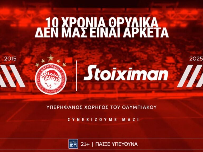 Η Stoiximan, η κορυφαία εταιρεία online gaming και αθλητικού στοιχήματος στην Ελλάδα και στην Κύπρο, ανακοινώνει με υπερηφάνεια μέσα από ένα επετειακό βίντεο την ανανέωση της συνεργασίας της με την ΠΑΕ Ολυμπιακός, επεκτείνοντας τον ρόλο της ως Μεγάλου Χορηγού της ομάδας έως και το 2028.