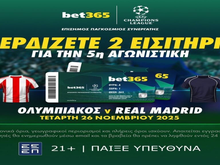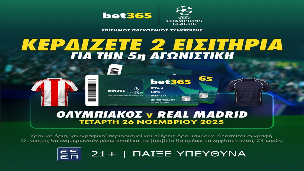 Μέχρι τις 23 Οκτωβρίου, η bet365 κληρώνει εισιτήρια για την 5η αγωνιστική της League Phase του UEFA Champions League. Ανάμεσά τους, μία από τις πιο συναρπαστικές αναμετρήσεις που έχουν διεξαχθεί στην Ελλάδα τα τελευταία χρόνια: Ολυμπιακός v Ρεάλ Μαδρίτης.