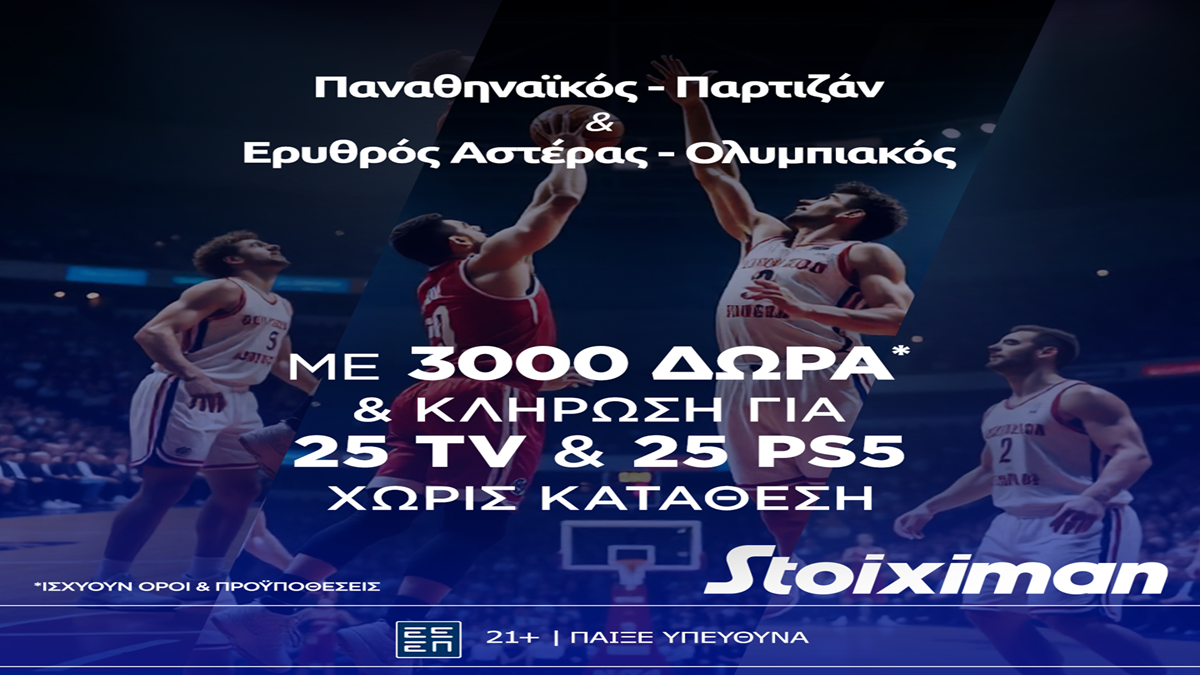 Προσφορά* γνωριμίας από τη Stoiximan με 3000 δώρα* χωρίς κατάθεση* και κλήρωση για ΤV 65’’ και PS5!